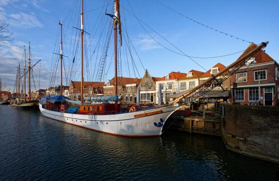 Обои Парусное судно Willem Barentsz с опущенными парусами на причале у домов