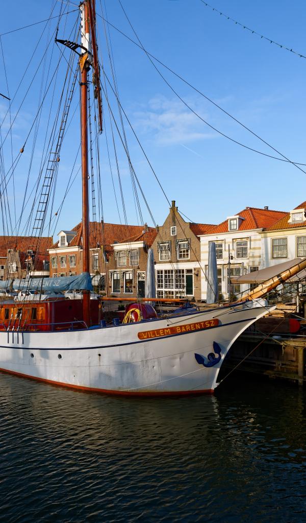 Обои Парусное судно Willem Barentsz с опущенными парусами на причале у домов