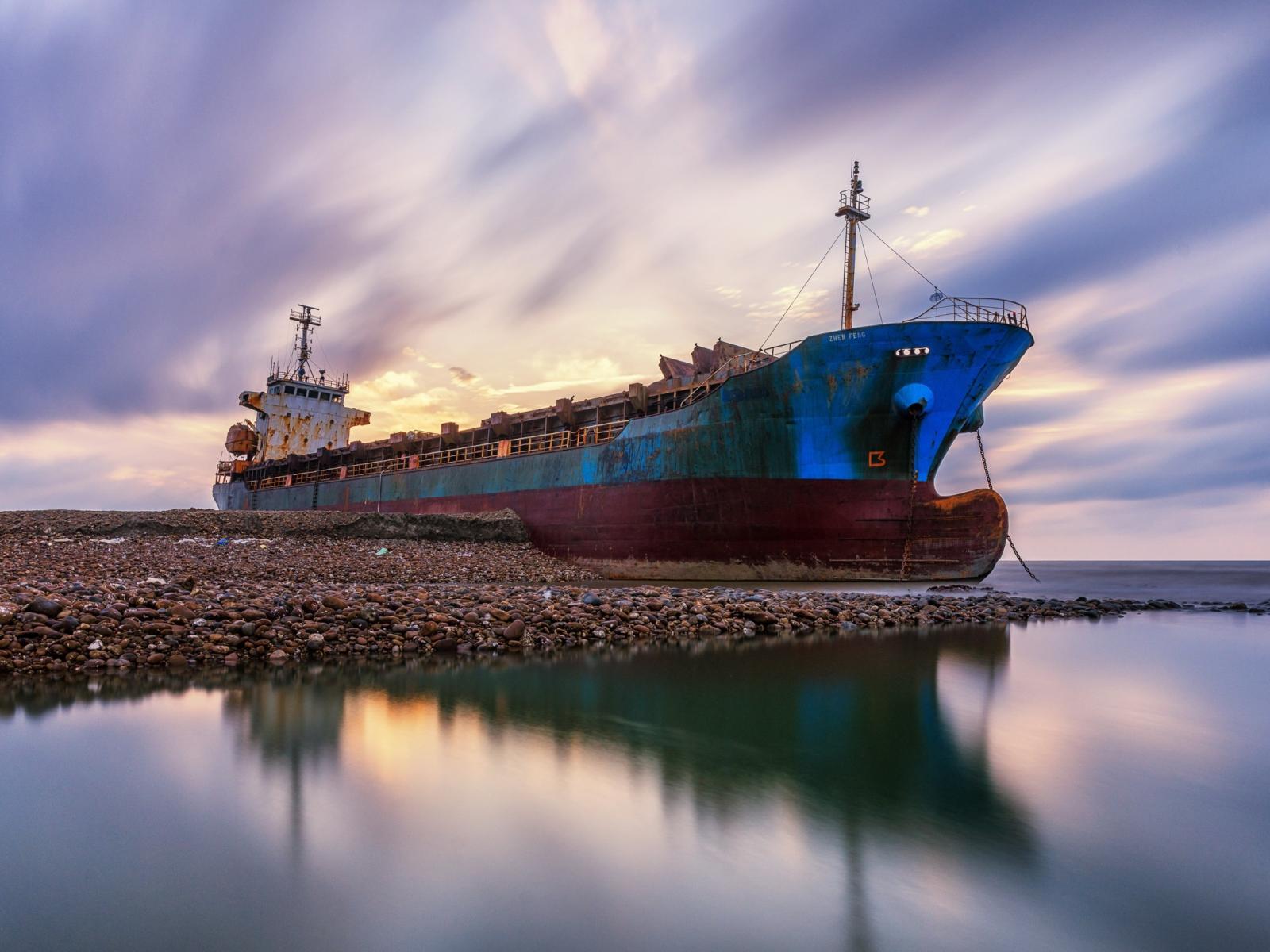 Обои Старый ржавый корабль на берегу под красивым небом