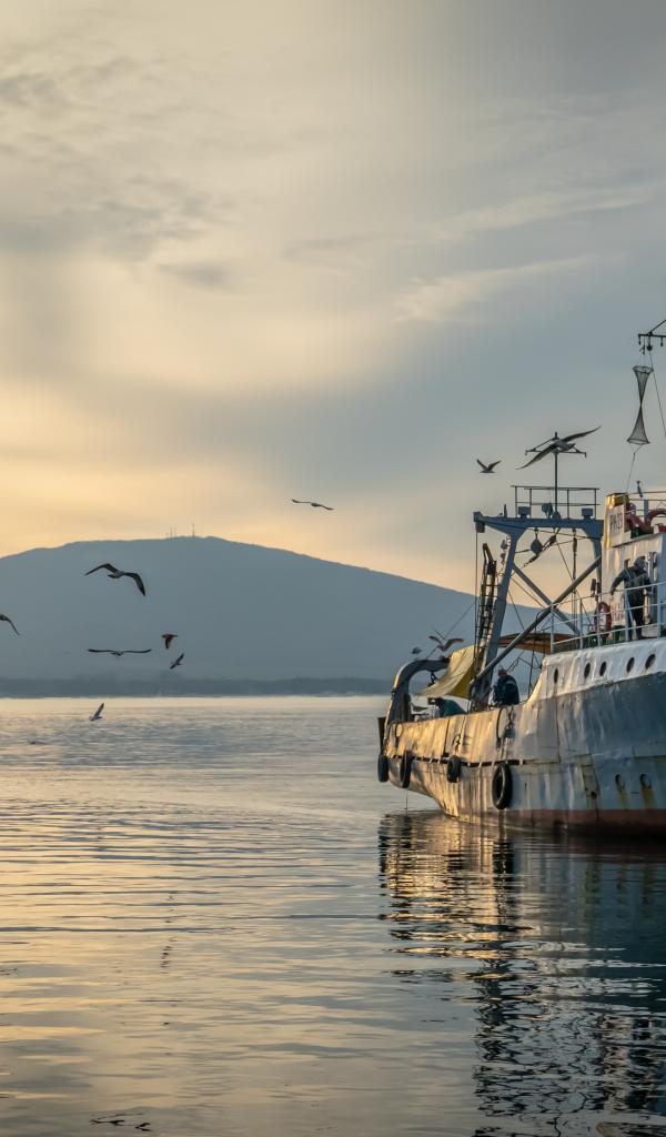 Обои Старое рыболовное судно в море на закате