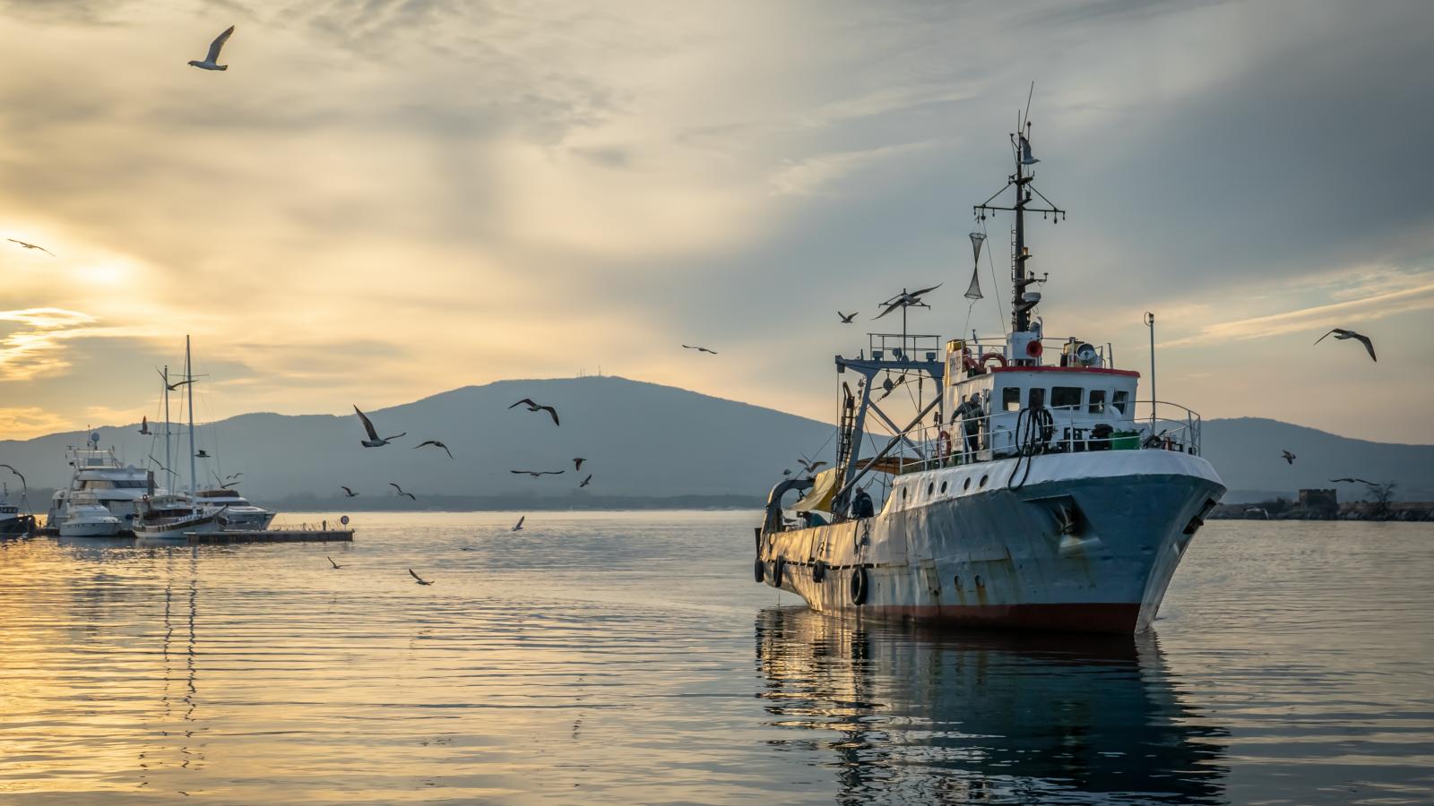Обои Старое рыболовное судно в море на закате