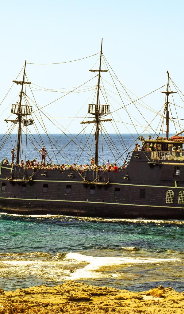 Обои Большой черный пиратский корабль у берега
