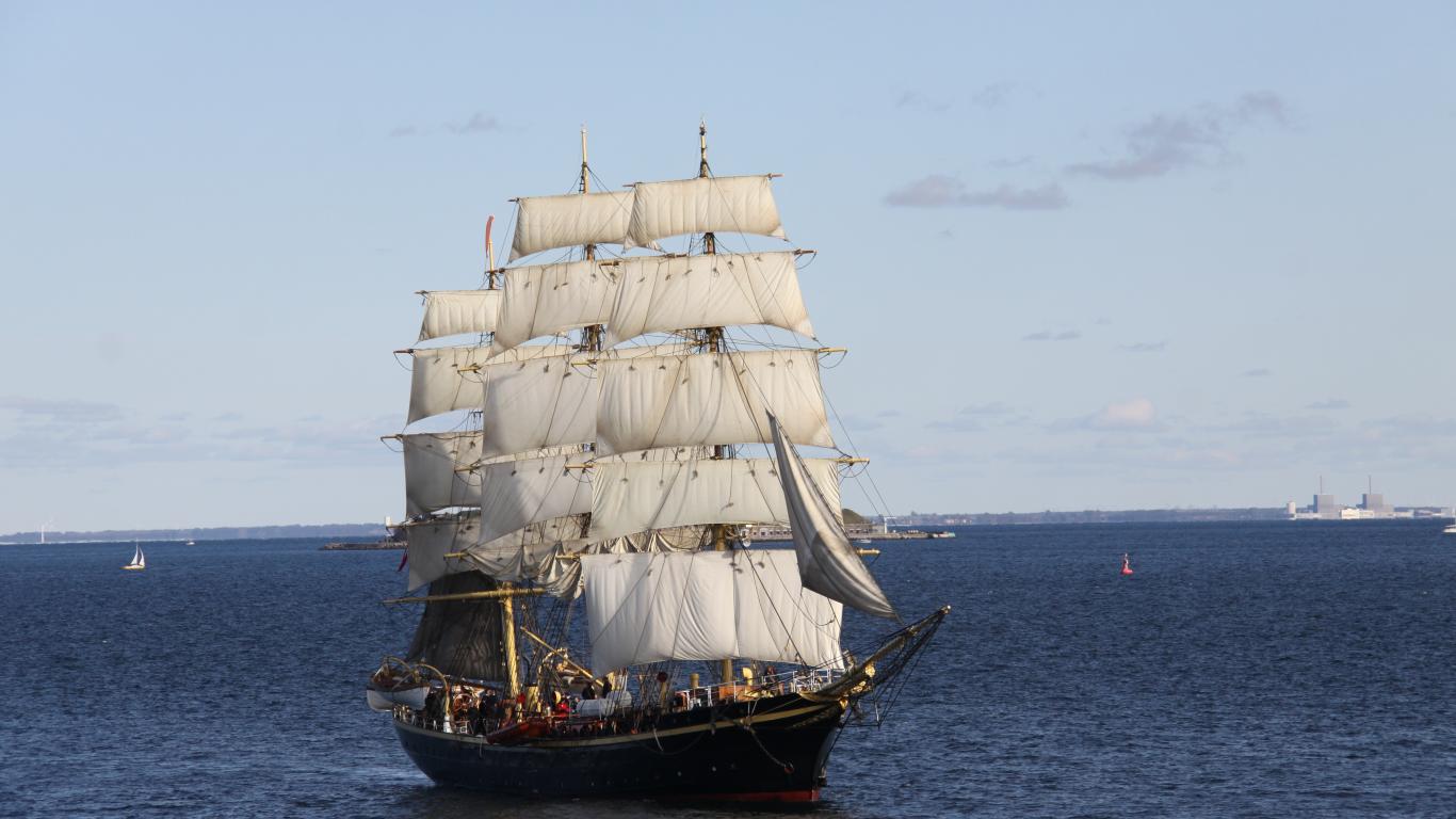 Обои Большой черный корабль с белыми парусами в море
