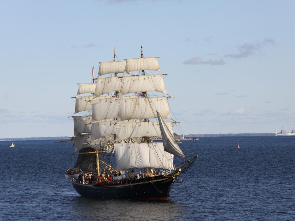 Обои Большой черный корабль с белыми парусами в море