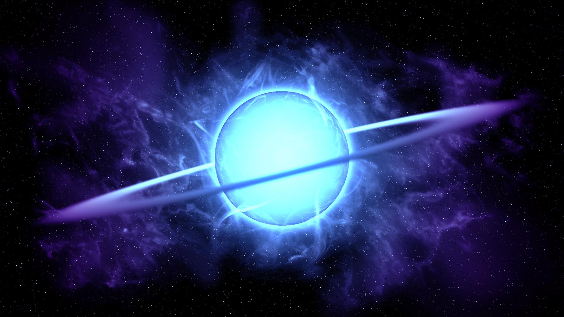 Обои Голубая неоновая планета с кольцом в темном небе