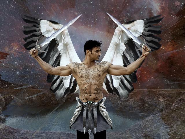 Обои Мужчина боевой ангел с татуировками на теле