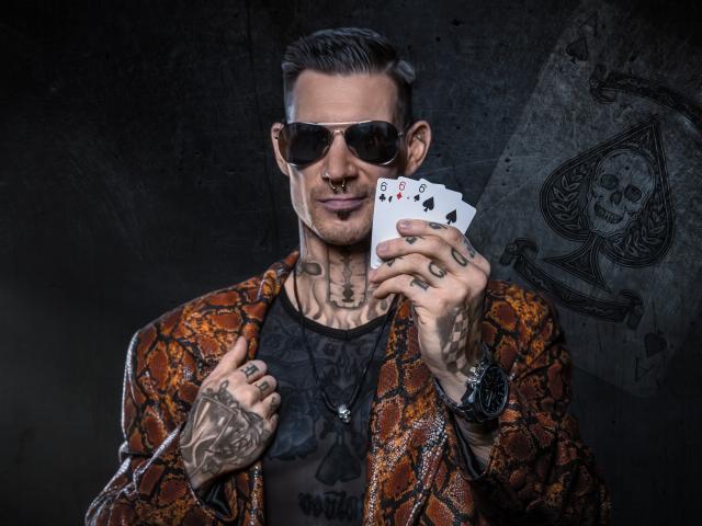 Обои Мужчина с татуировками на теле держит в руке три карты шестерки