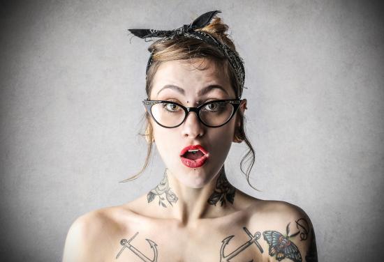 Обои Удивленная девушка в очках с татуировками на теле