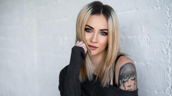 Обои Стильная блондинка с татуировкой на плече на фоне стены