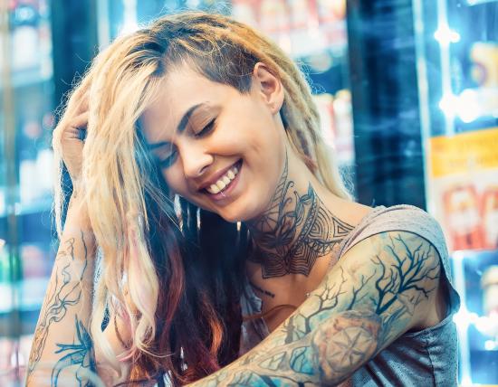 Обои Улыбающаяся девушка с татуировками на теле