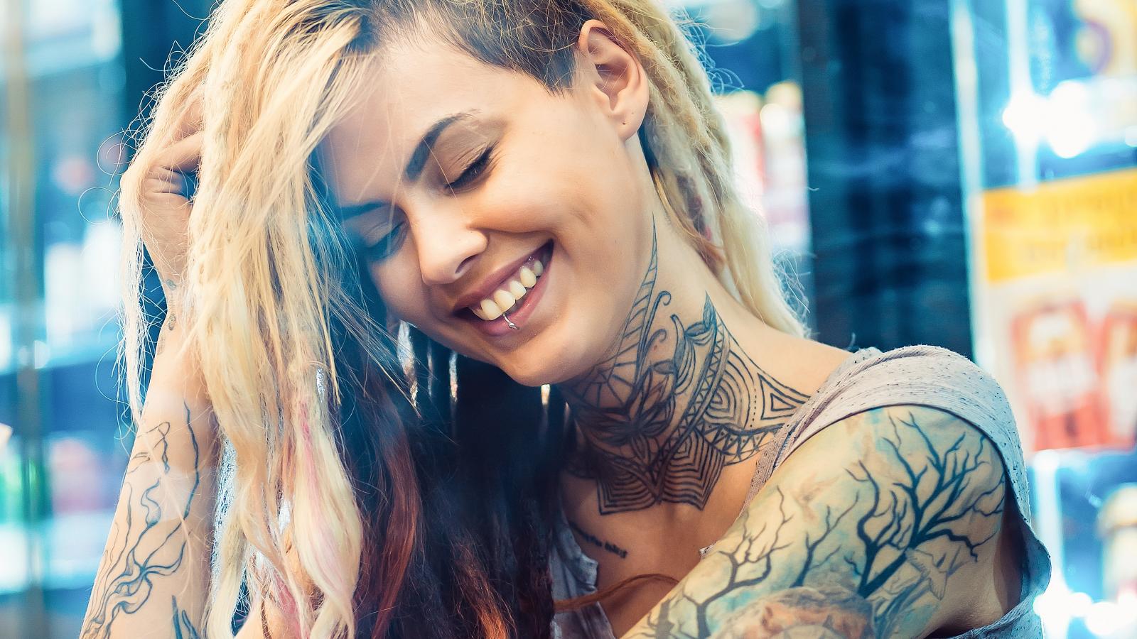 Обои Молодая девушка с белыми волосами с татуировками на теле