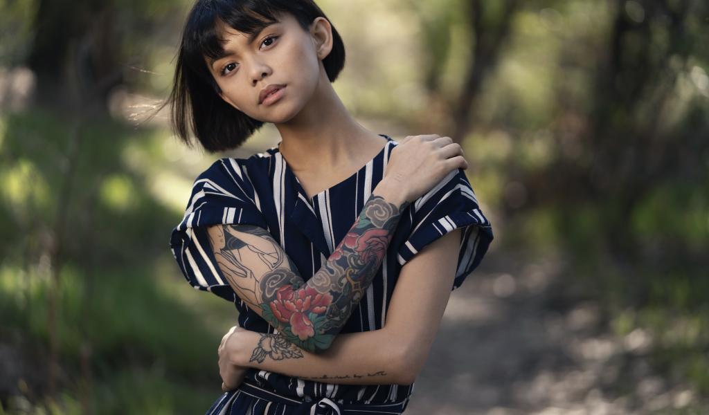 Обои Красивая девушка азиатка с татуировками на руках
