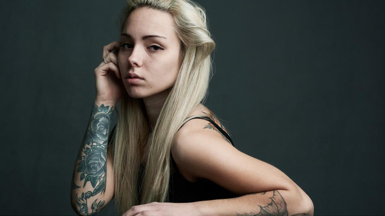 Обои Красивая блондинка с татуировками на теле на сером фоне