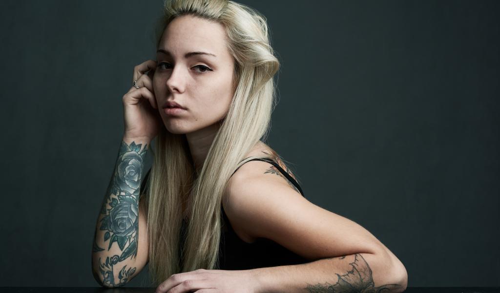 Обои Красивая блондинка с татуировками на теле на сером фоне