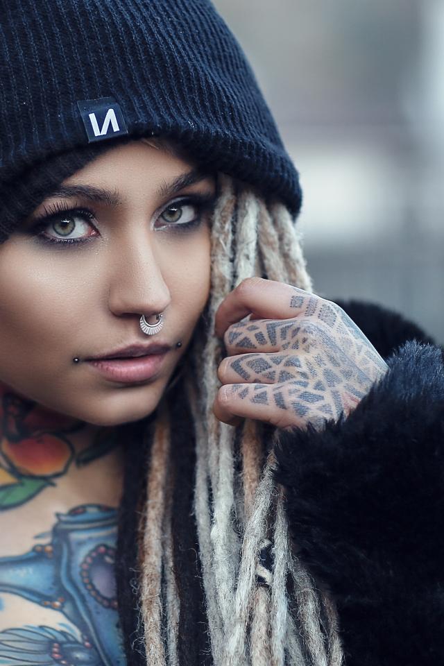 Обои Красивая девушка в черной шапке с татуировками на теле