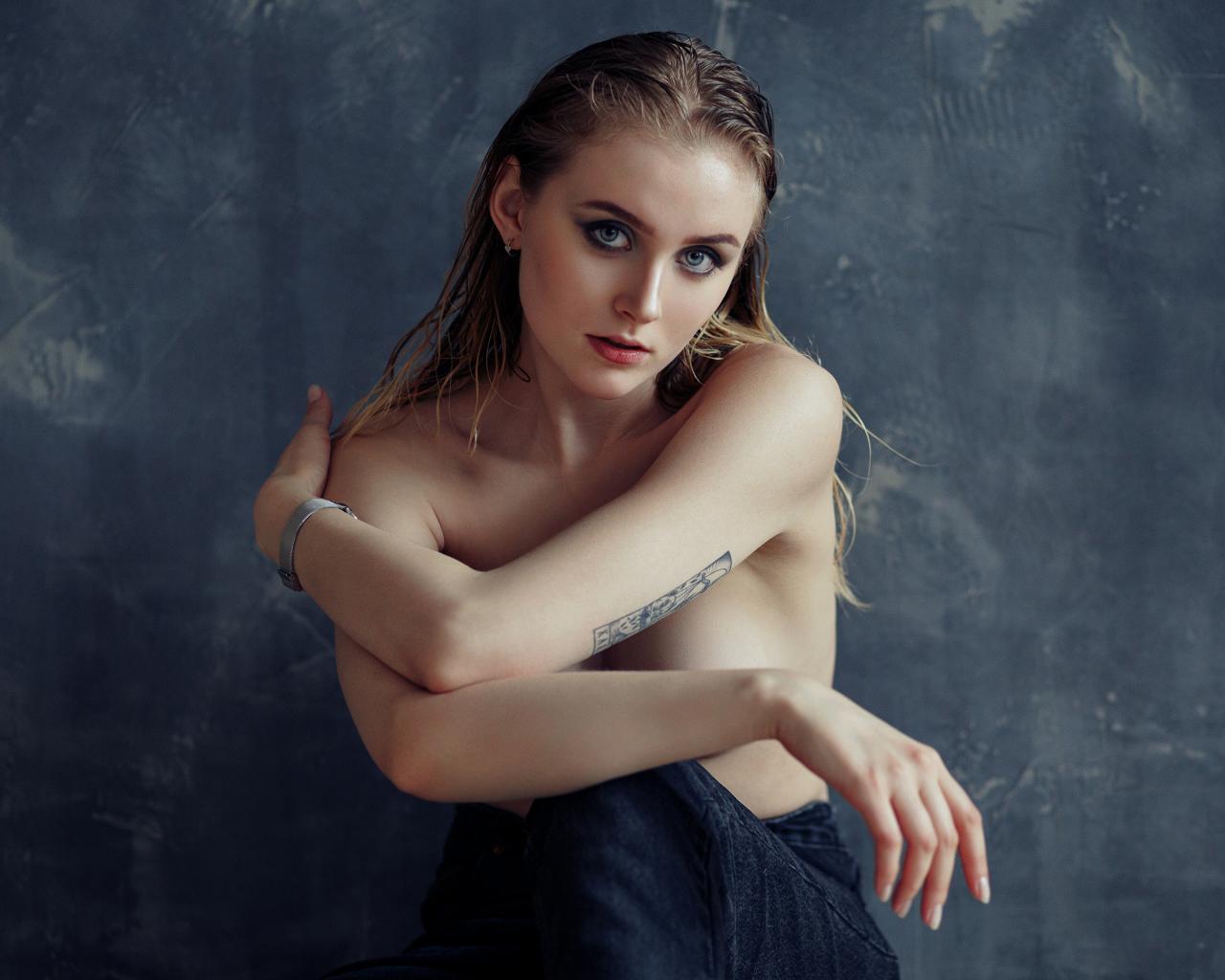 Обои Нежная девушка с татуировками на теле сидит у стены