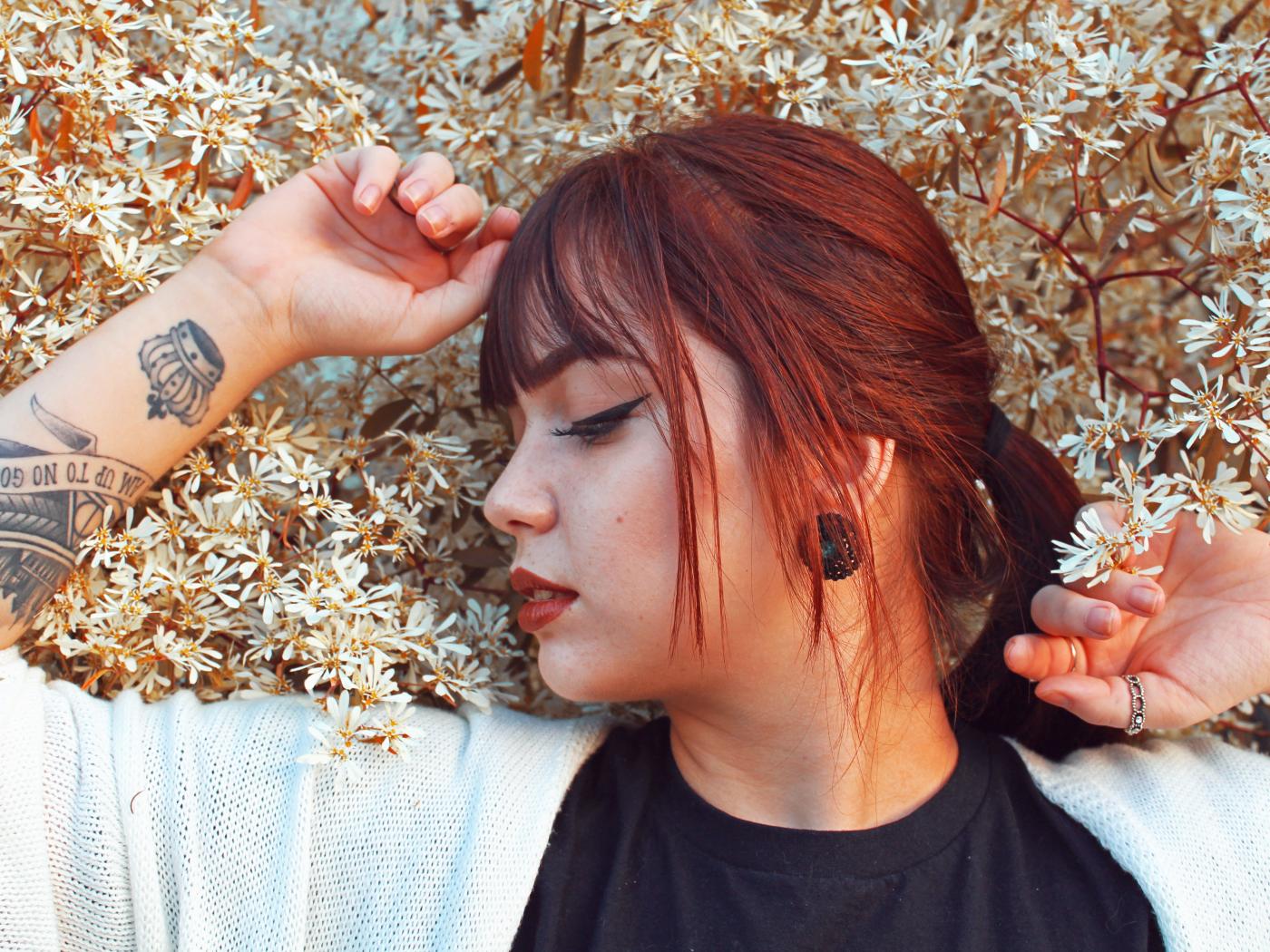Обои Молодая девушка с татуировкой на руке стоит у цветущего дерева