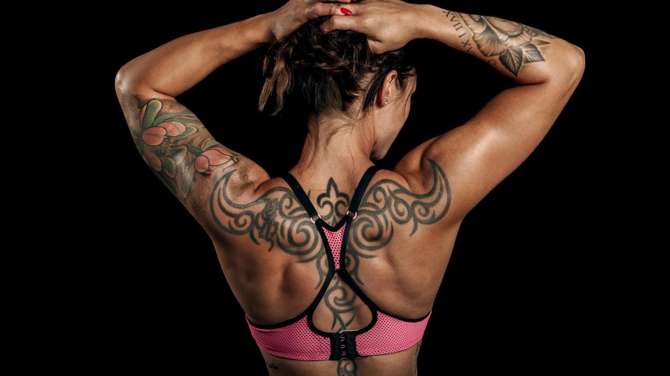 Обои Татуировки на теле спортивной девушки на черном фоне