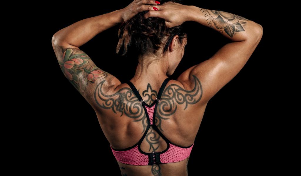 Обои Татуировки на теле спортивной девушки на черном фоне