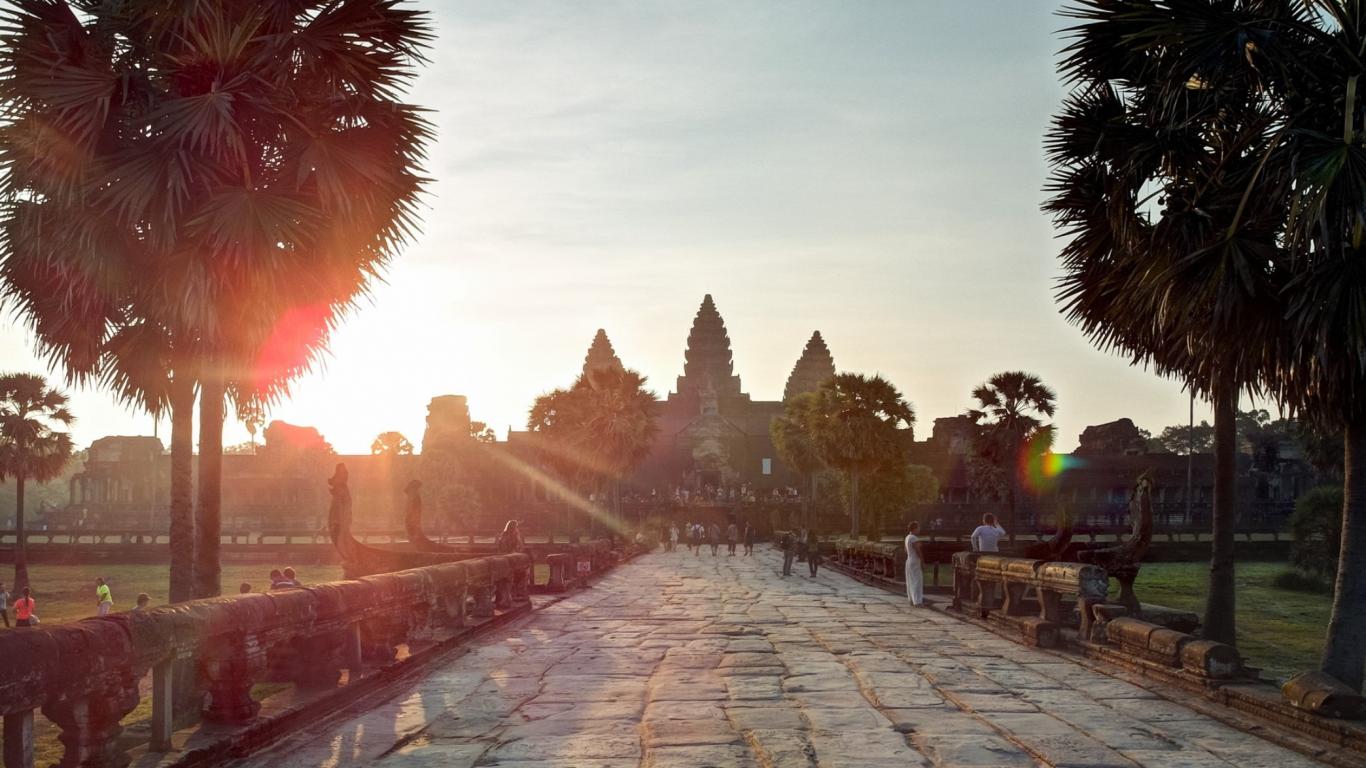 Обои Аллея на закате у храмового комплекса Ангкор Ват в Камбодже
