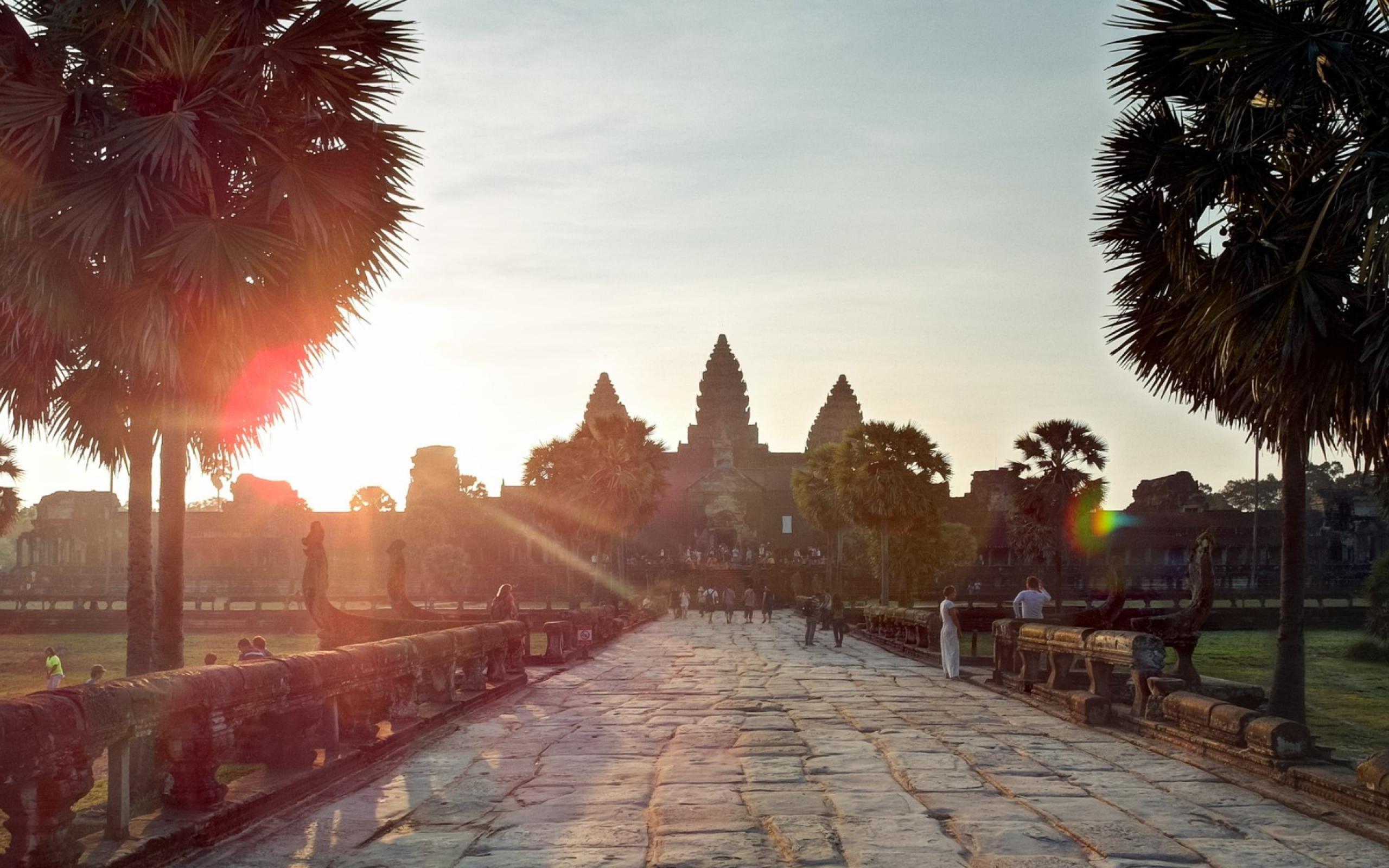Обои Аллея на закате у храмового комплекса Ангкор Ват в Камбодже
