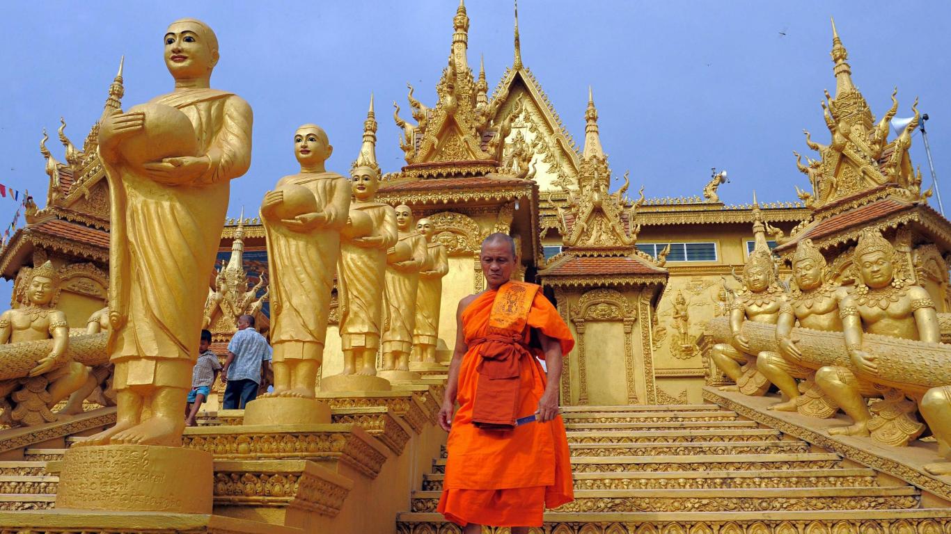 Обои Монах на ступеньках старинного храма, Камбоджа