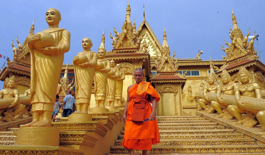 Обои Монах на ступеньках старинного храма, Камбоджа