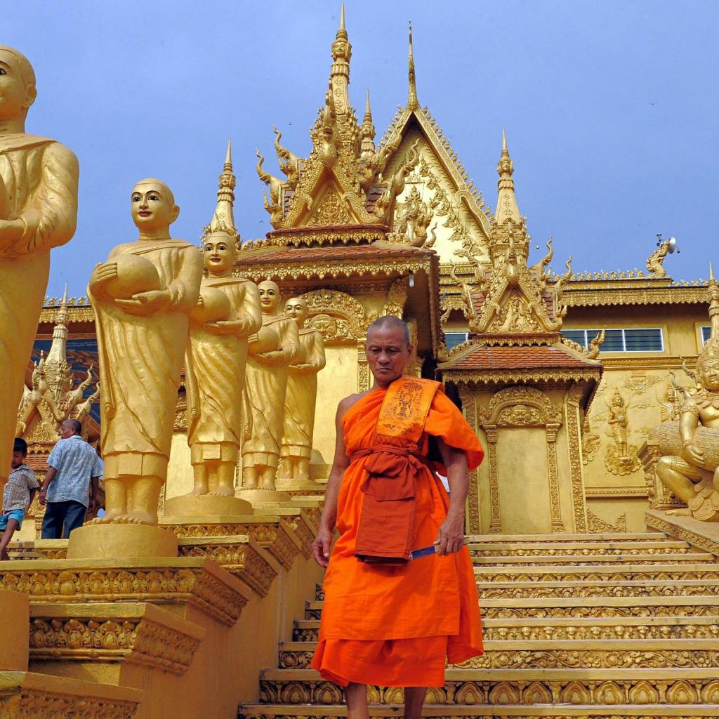 Обои Монах на ступеньках старинного храма, Камбоджа