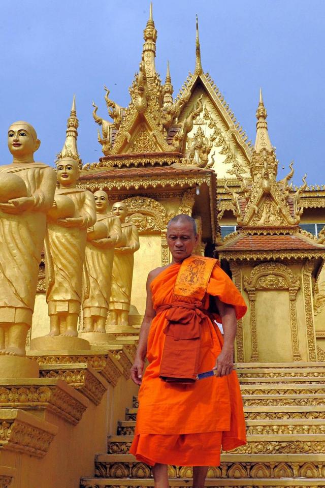 Обои Монах на ступеньках старинного храма, Камбоджа