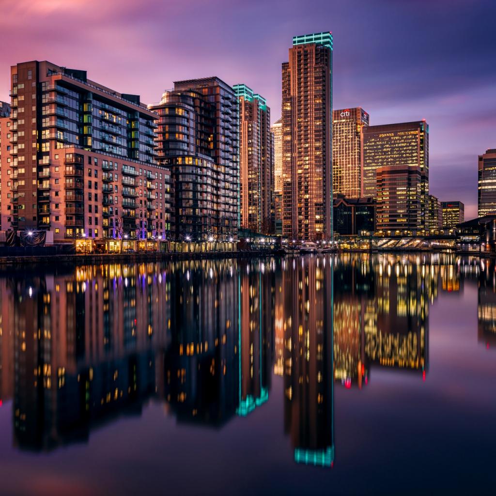 Обои Ночные небоскребы Лондона отражаются в воде, Великобритания