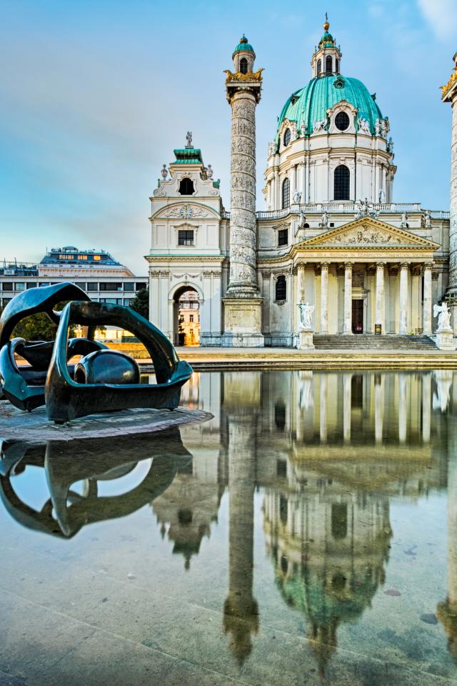 Обои Фонтан у католической церкви Карлскирхе , Вена. Австрия