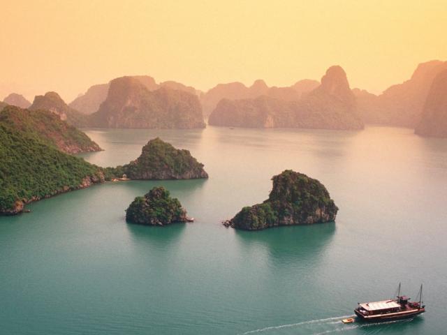 Обои Покрытые лесом острова в бухте Халонг, Вьетнам