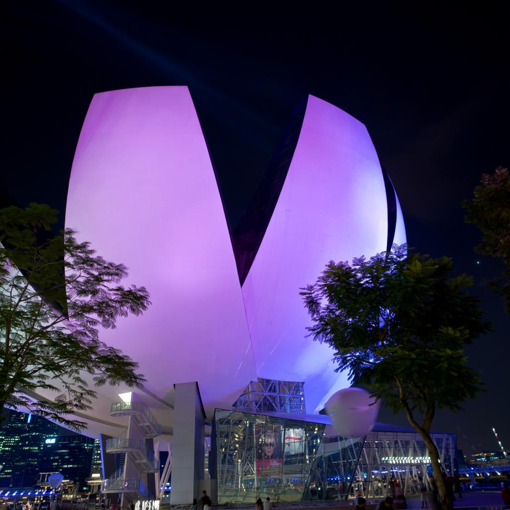 Обои Необычное фиолетовое здание ночью, Сингапур