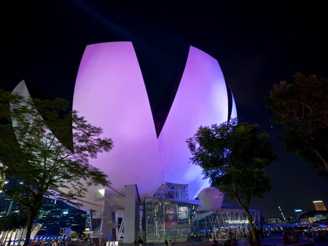 Обои Необычное фиолетовое здание ночью, Сингапур