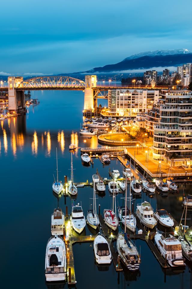 Обои Лодки у причала на фоне ночных огней города Ванкувер, Канада