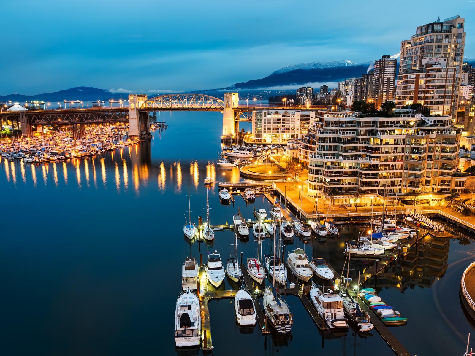 Обои Лодки у причала на фоне ночных огней города Ванкувер, Канада