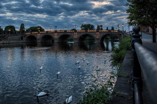 Обои Белые лебеди плавают в реке у вечернего моста, Англия