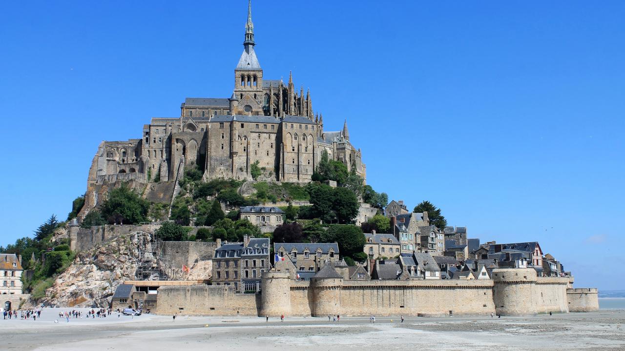 Обои Замок Мон-Сен-Мишель на фоне голубого неба, Франция
