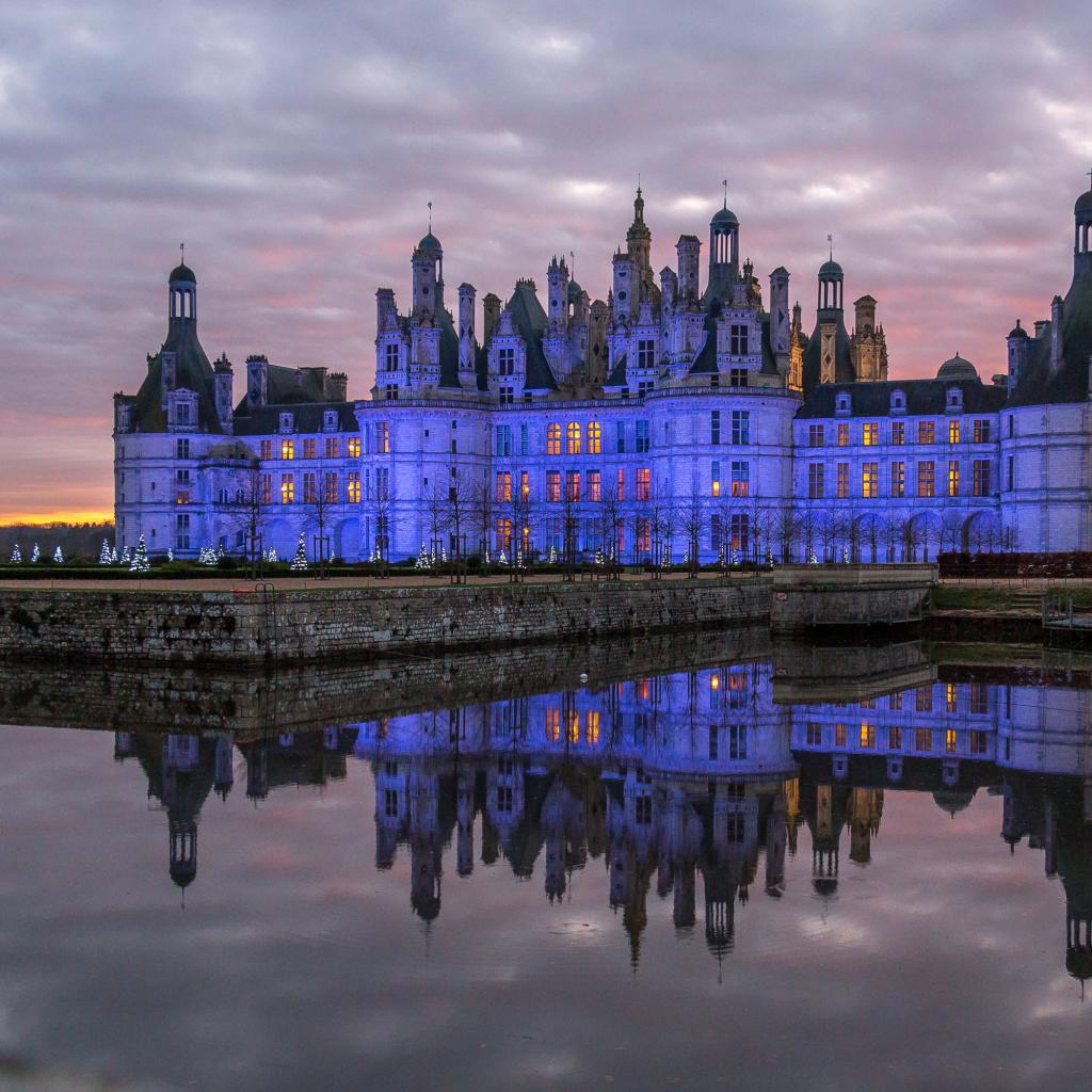 Обои Замок Шамбор отражается в воде в сумерках, Франция