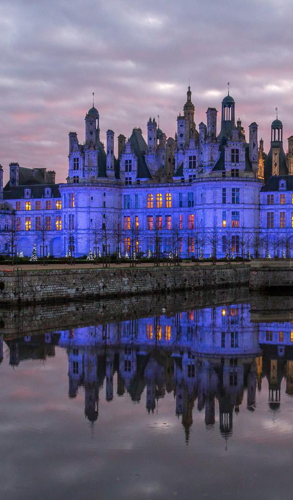 Обои Замок Шамбор отражается в воде в сумерках, Франция