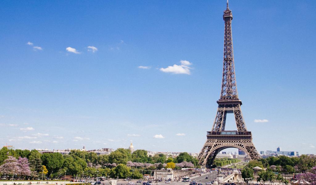 Обои Красивый вид на знаменитую Эйфелеву башню под голубым небом, Париж