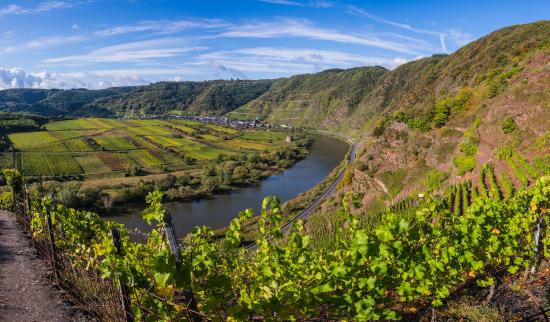 Обои Вид на виноградники у реки под голубым небом, Германия
