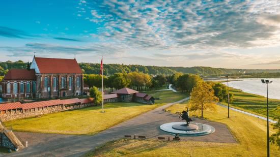 Обои Памятник у старого здания у реки, Литва