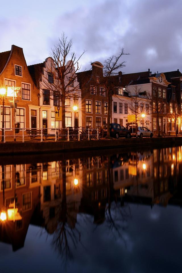 Обои Дома на берегу канала вечером, Нидерланды