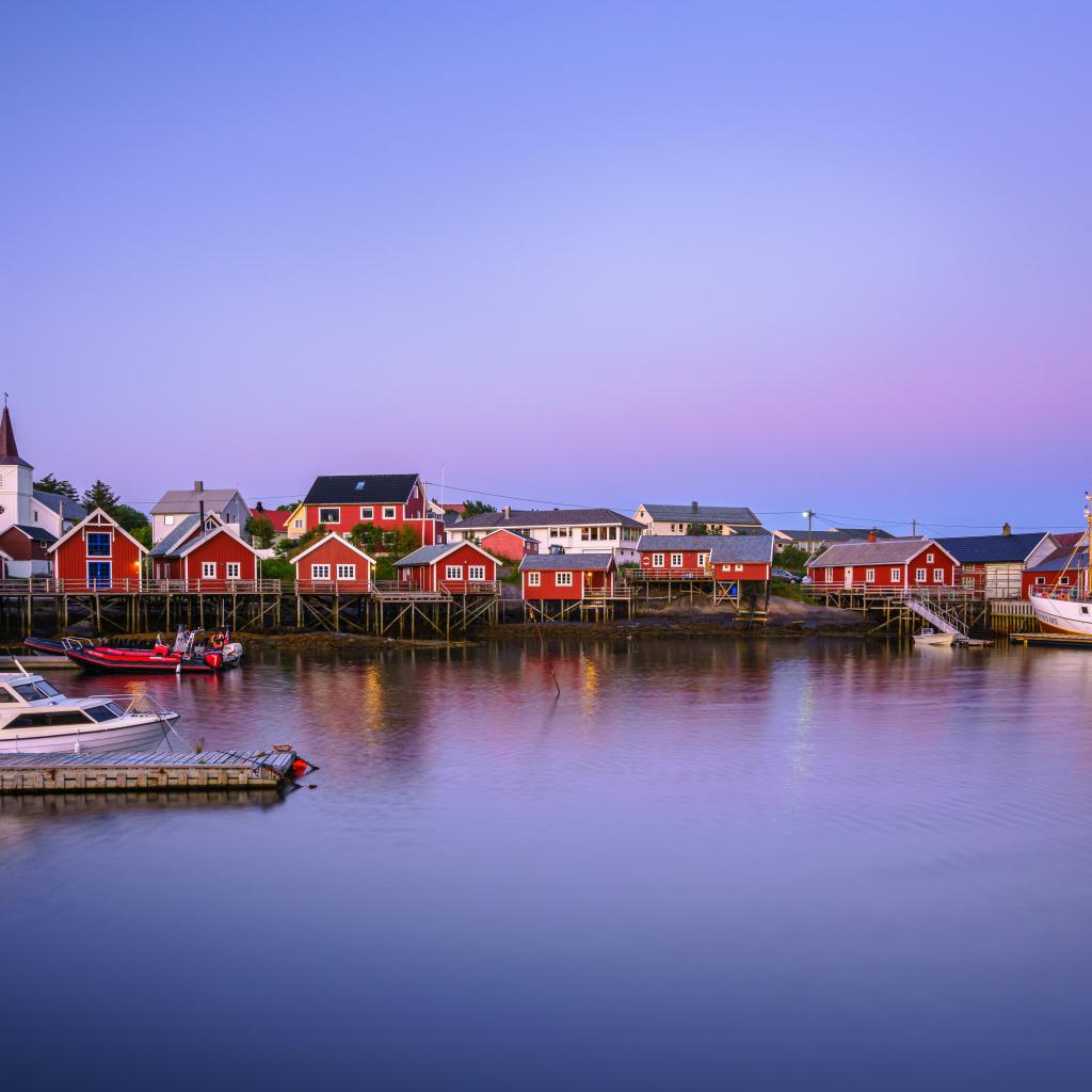 Обои Красные дома на сваях на берегу залива, Норвегия