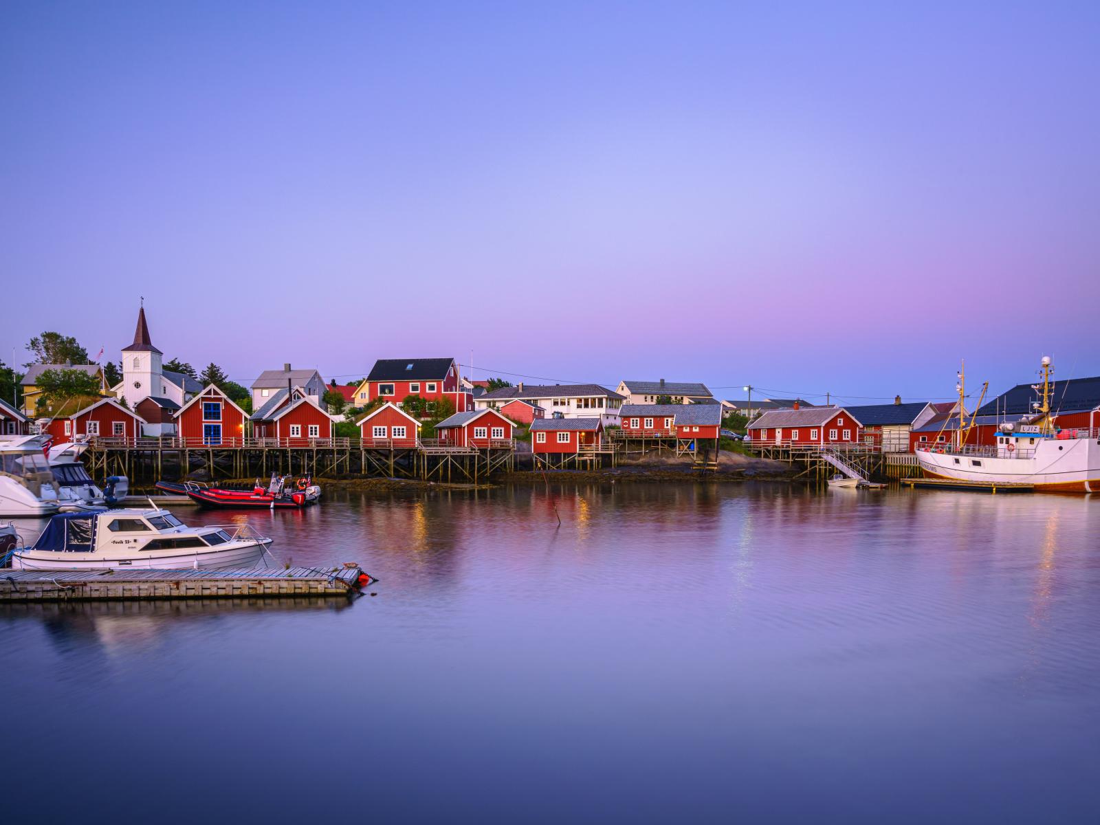 Обои Красные дома на сваях на берегу залива, Норвегия