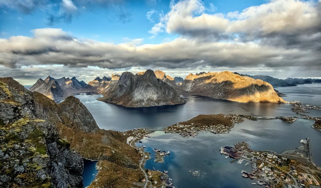 Обои Лофотенские острова под голубым небом с белыми облаками, Норвегия