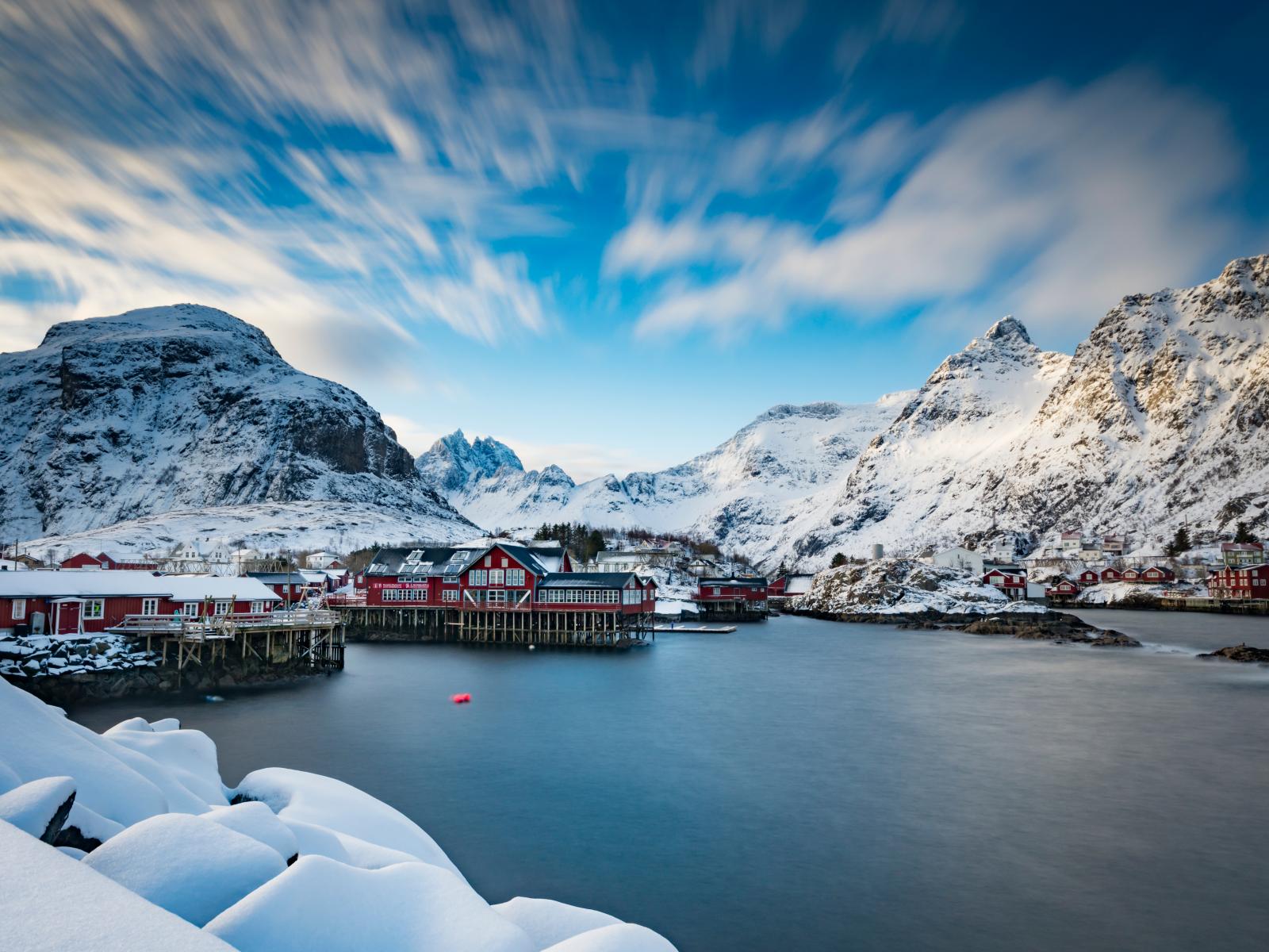 Обои Покрытые снегом горы у озера с домами, Лофотенские острова