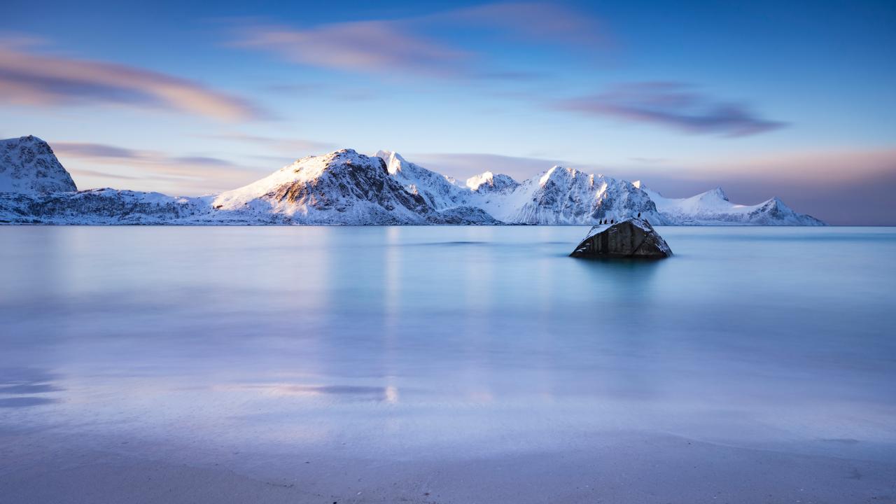 Обои Красивый вид на спокойный залив и заснеженные горы, Норвегия
