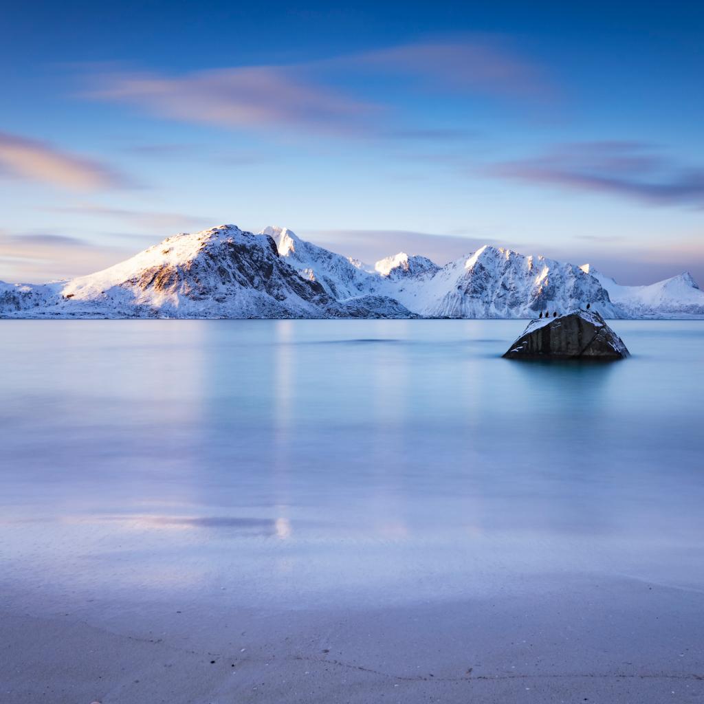 Обои Красивый вид на спокойный залив и заснеженные горы, Норвегия